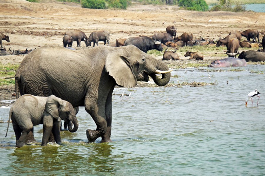 野生動物にはゾウ、ライオン、ヒョウ、バッファロー、カバ、多様な鳥類などがいる。