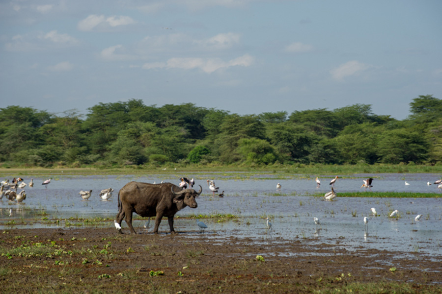 ンゴロンゴロ保全地域へ北上するルートは、マニヤラ湖国立公園だ。公園の入り口は、キスワヒリ語でモスキート川を意味するムト・ワ・ムブという地元の小さな村にある。リフトバレーの断崖の麓に位置するこの公園には、ピンクフラミンゴやペリカン、400種以上の鳥が飛来する。植生のコントラストは、草原を開く青々としたジャングルの森で構成されている。水辺の平原には、キリン、バッファロー、シマウマ、ヌー、ゾウがいる。カバがプールのような湖の縁によじ登り、到着すると騒々しい地鳴きのようなカラオが出迎えてくれる。ヒヒは公園入口付近の道路にぶら下がって、通り過ぎる世界を見て喜んで過ごしている。マニヤラ湖は、有名な木登りライオンでも知られ、氾濫原のすぐ内側のアカシアの森でよく見られる。公園の面積は330平方キロメートルで、水位が高いときにはソーダ湖が200キロメートルまで広がる。リフトバレーの断崖絶壁の頂上からの眺めは息をのむほど美しい。湖は何キロにもわたって広がり、フラミンゴのピンク色の毛布が景色を覆っている。