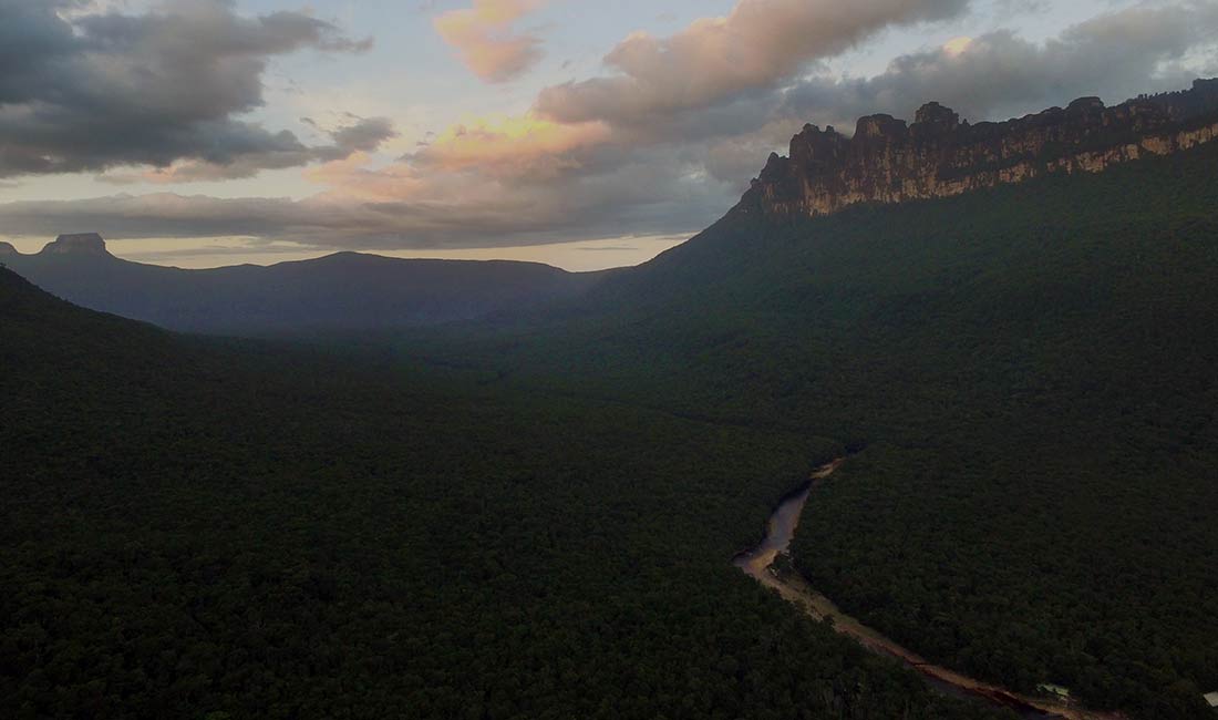 広大な公園には、ユニークなテーブル状の山(テプイ)、緑豊かな熱帯雨林、見事な滝がある。