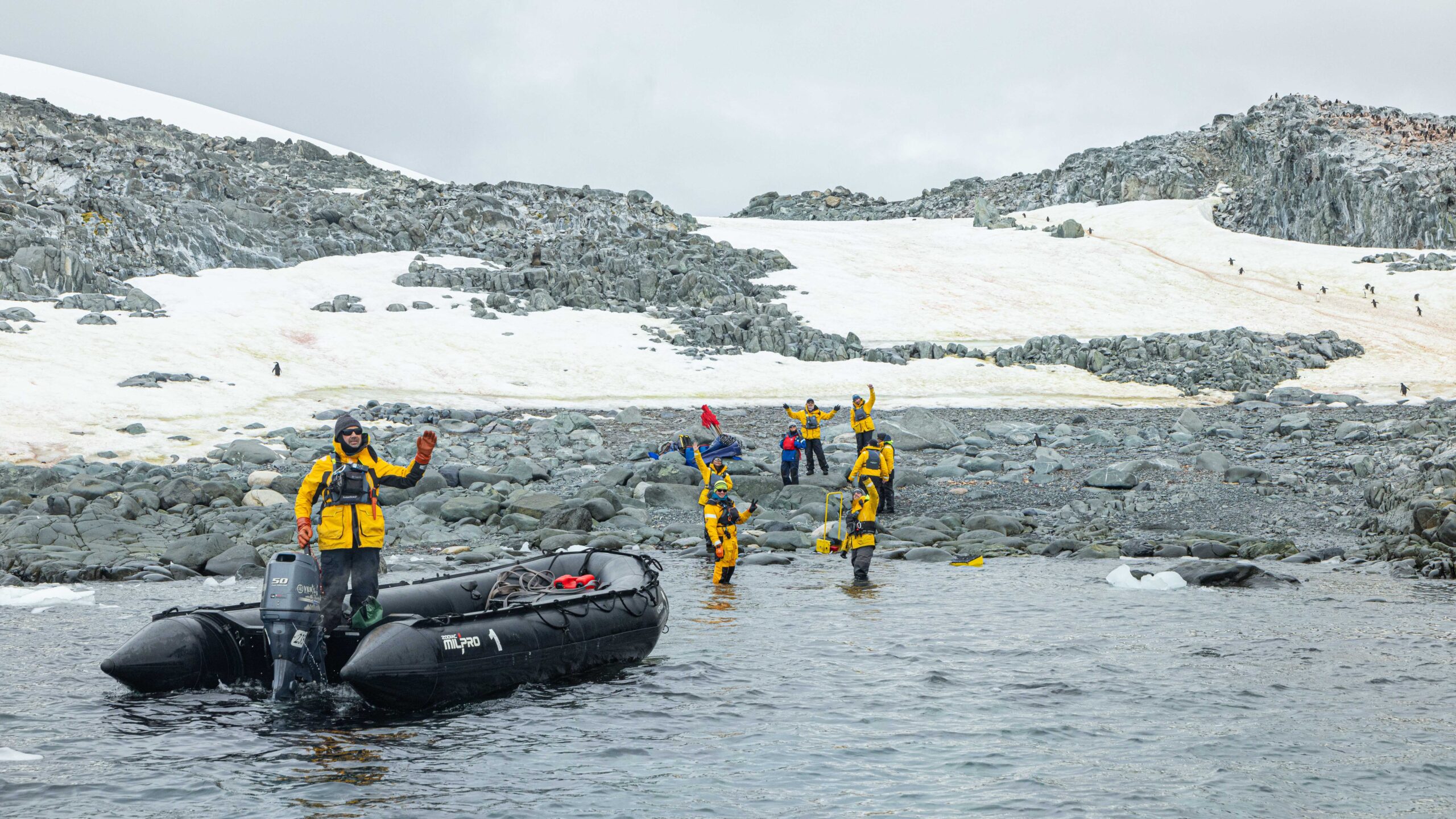 キングジョージ島では、チリのフライ基地やロシアのベリングスハウゼン基地を横目に見ながら、海岸へと向かいます。そこからはゾディアックボートに乗り換え、探検船へと乗り込みます。これから待ち受ける未知の大地と出会う冒険のスタートです。