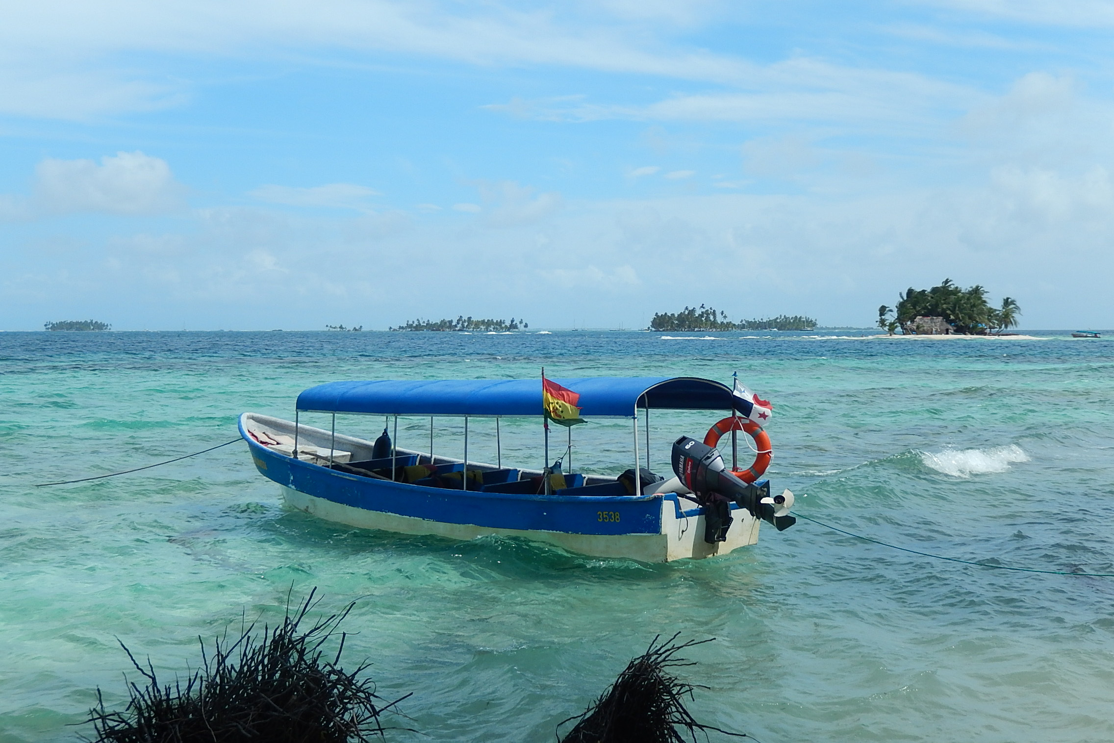 "一日の始まりは、ホテルでの朝食か、スケジュールによってはお弁当の朝食。その後、陸路と船でサンブラス諸島ツアーに出発します。まず、4WD車で山道を走り、港に到着します。そこからボートに乗り換え、カリブ海の透き通った海を楽しみながら、サンブラス諸島の素晴らしい島々を巡ります。